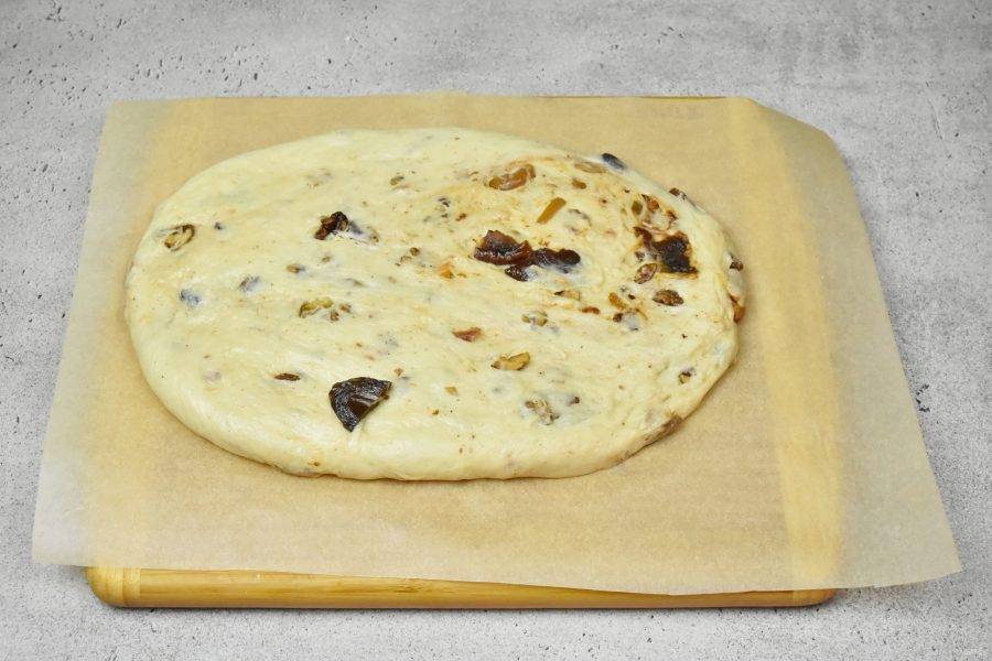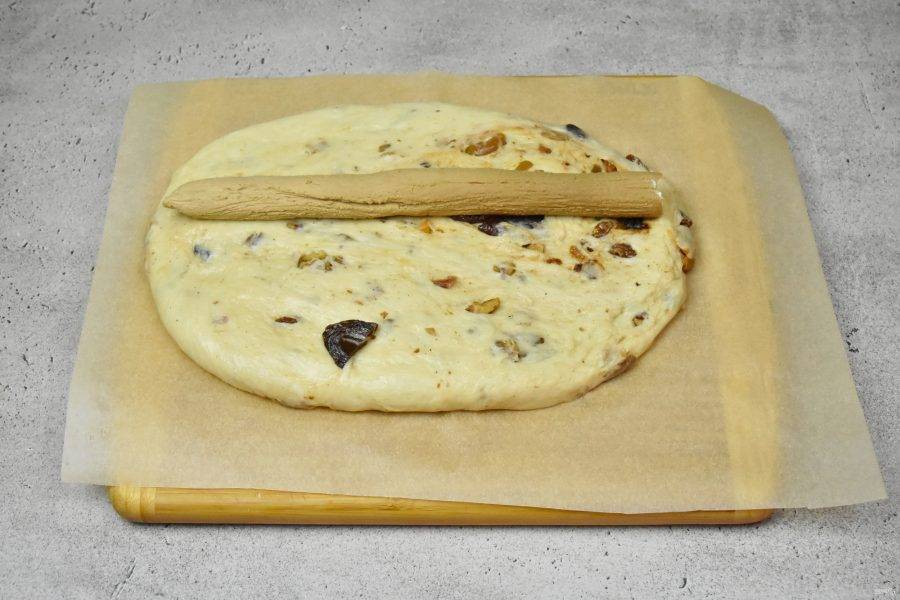 Через час можно приступить к формовке штолленов. Разделите тесто на 2 части, весом примерно 700-800 граммов. Если желаете сделать выпечку небольшого размера можно разделить тесто на 3 или 4 части. Каждую часть разомните в лепешку овальной формы. Удобно формировать штоллены на пергаменте для выпечки.