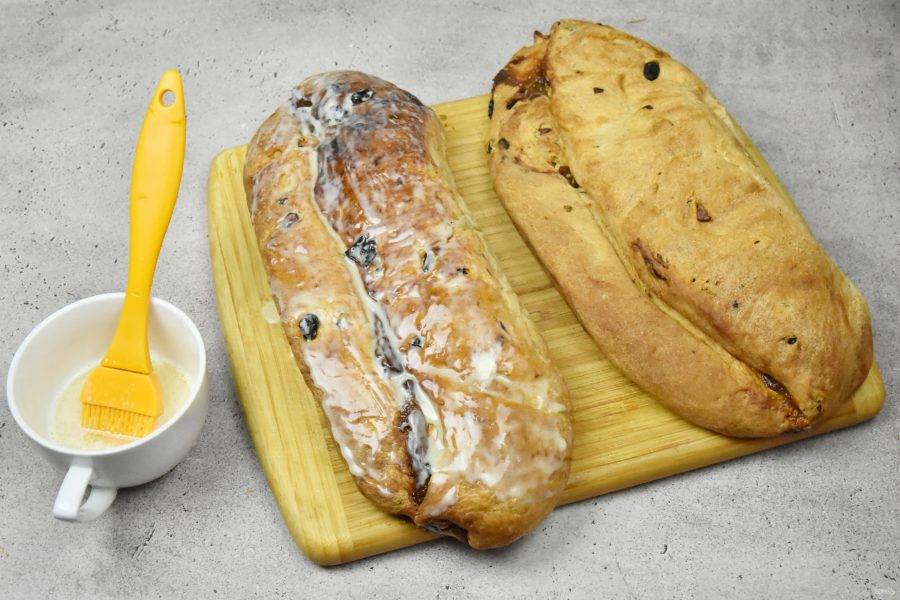 Духовку разогрейте до 180 градусов. Выпекайте штоллены 40-45 минут. Готовность выпечки проверьте деревянной лучинкой. 2-3 минуты дайте штолленам отдохнуть. Еще горячую выпечку смажьте растопленным сливочным маслом.