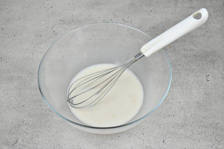 Молоко влейте в миску. Всыпьте сахар и раскрошите живые дрожжи. Размешайте смесь венчиком до полного растворения.