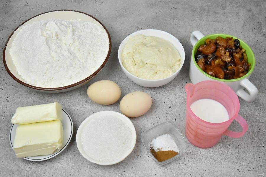 Для приготовления теста подготовьте необходимые продукты: опару, муку, сливочное масло, яйца, специи, соль, сахар, молоко. Сухофрукты и цукаты заблаговременно залейте коньяком и дайте им настояться. Масло и яйца заранее извлеките из холодильника.
