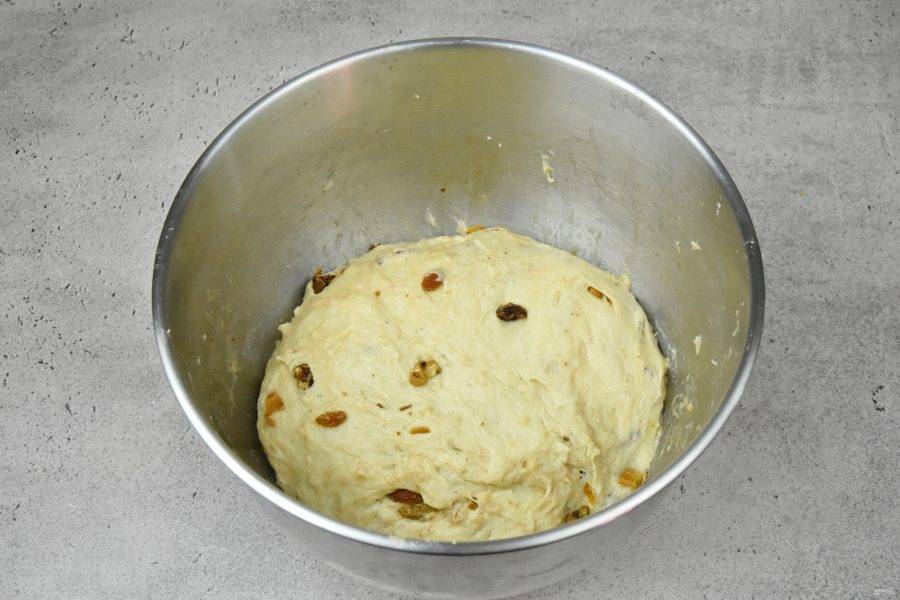 Пока тесто поднимается подготовьте наполнитель. Сухофрукты откиньте на сито для удаления лишней влаги. Просушите их на бумажном полотенце. Орехи поджарьте на сухой сковороде. Соедините сухофрукты, орехи, цукаты и добавьте в подошедшее тесто. Хорошо вмешайте, чтобы они равномерно распределился по всему объему теста. Округлите тесто и снова дайте ему время для подъема.