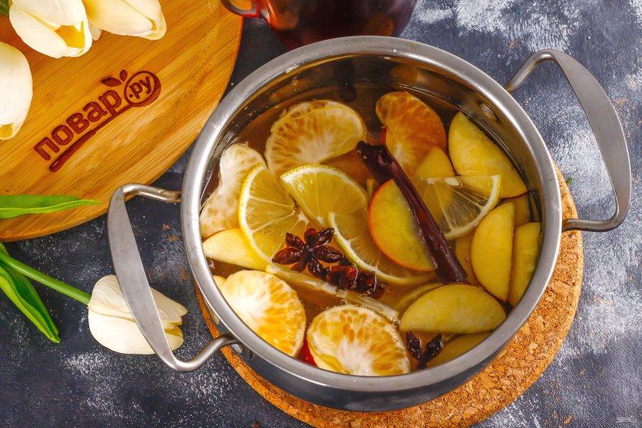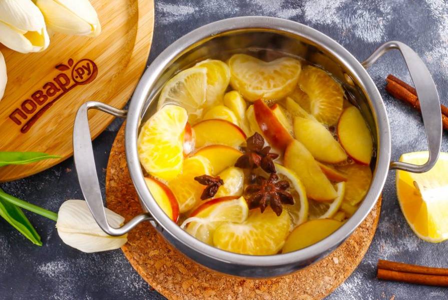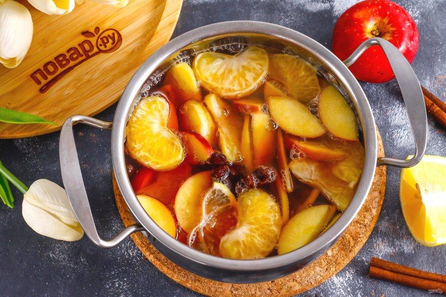 Отварите фруктовые нарезки примерно 10 минут на умеренном нагреве, чтобы они отдали жидкости свой аромат и вкус.