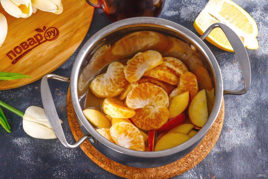 Яблоки промойте в воде, разрежьте на четыре части и срежьте семенные блоки. Нарежьте ломтиками в кастрюлю или ковш. Мандарин очистите от кожуры и белого слоя под ней. Разделите плод на дольки и добавьте в емкость вместе с ломтиками лимона.