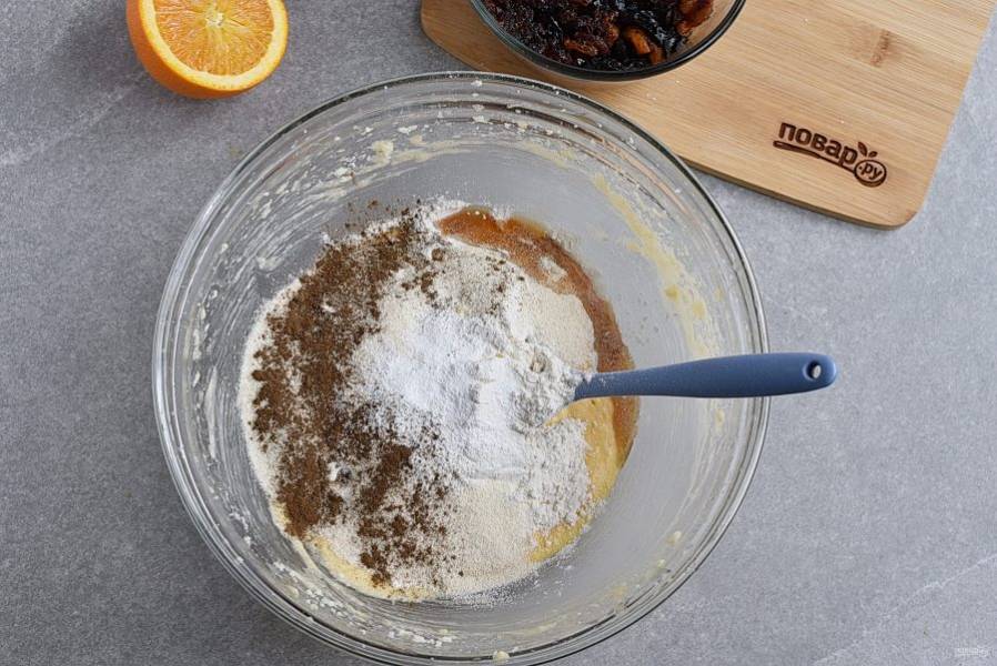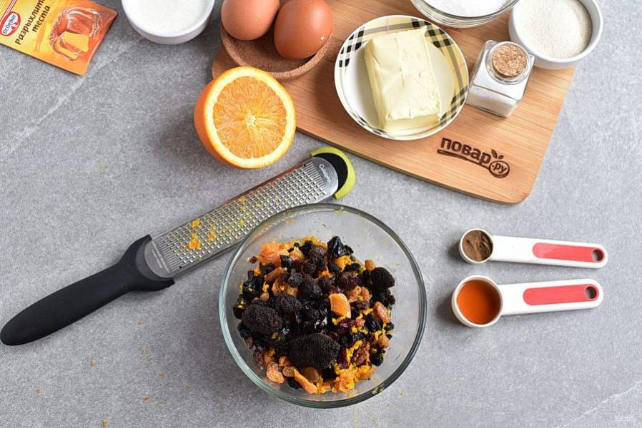 Начнем с экспресс-подготовки сухофруктов. Промойте сухофрукты, выложите в миску, подходящую для микроволновой печи. Добавьте цедру и сок половины апельсина, темный сахар и 50 мл. горячей воды. Перемешайте и поставьте в микроволновку на 3 минуты. Дайте постоять 5 минут и еще раз поставьте в микроволновку на 3 минуты при половинной мощности. Остудите. Если хотите, добавьте 1-2 столовых ложки крепкого ароматного алкоголя — рома или коньяка.