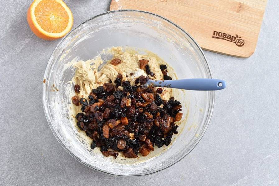 Добавьте сухофрукты и еще раз быстро перемешайте.