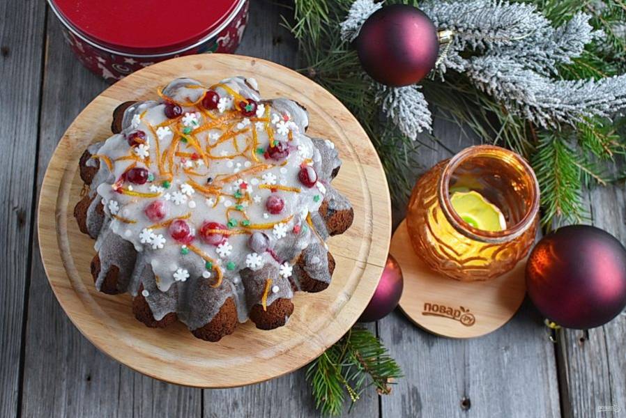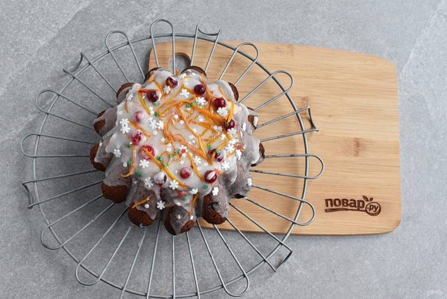 Покройте кекс глазурью и украсьте цедрой, свежей или засахаренной клюквой, кондитерскими посыпками.