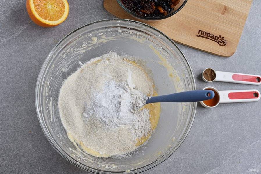 Смешайте муку, разрыхлитель, соль и манную крупу.