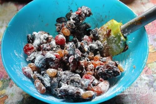 8. В смесь сухофруктов добавьте пару ложек муки, перемешайте.