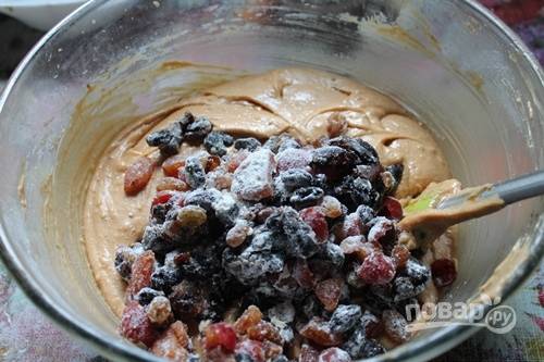 16. Выложите в тесто сухофрукты и смесь орехов. Тщательно перемешайте до однородности.