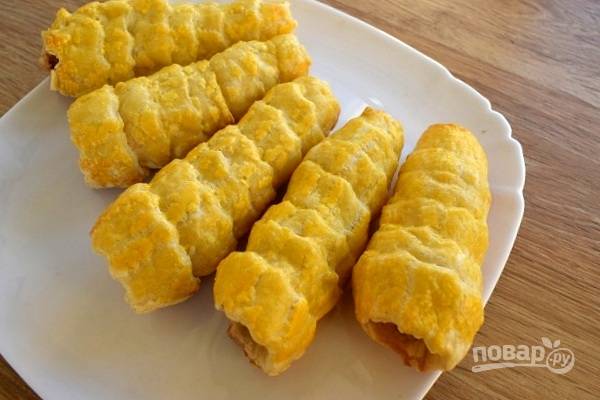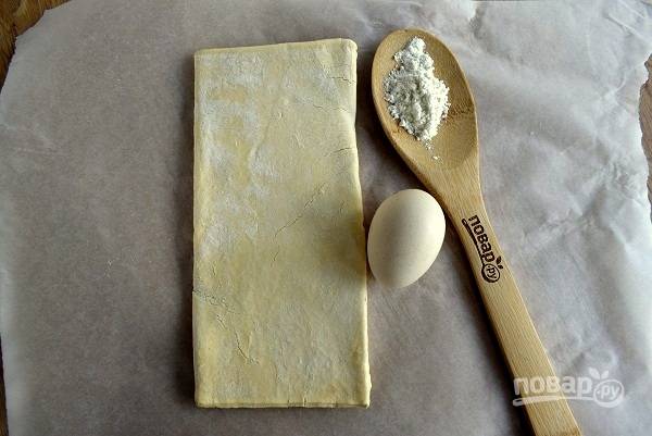 Тесто заранее достаньте из морозильника и разморозьте при комнатной температуре. Рабочую поверхность присыпьте немного мукой.