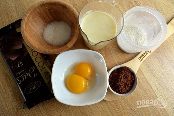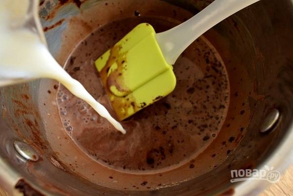 Смешайте яичные желтки, сахар. Просейте муку и какао, перемешайте до однородности. Постоянно перемешивая, добавьте молоко. Поставьте на медленный огонь и варите до загустения, периодически взбивая массу.