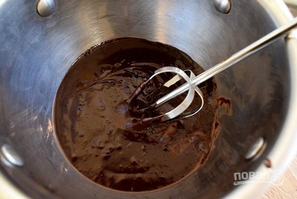 Темный шоколад поломайте на кусочки, добавьте в крем. Прогрейте крем на медленном огне, взбивая венчиком до однородности. Готовый крем немного остудите, поместите в кондитерский мешок и оставьте в холодильнике на 15 минут.