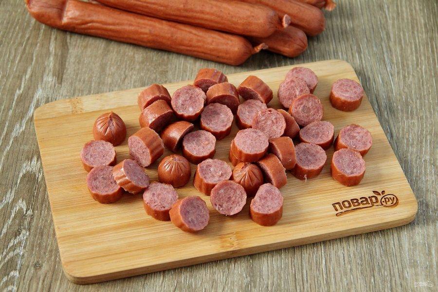 Нарезаем колбаски кружочками. Если необходимо, обязательно снимаем перед этим оболочку.