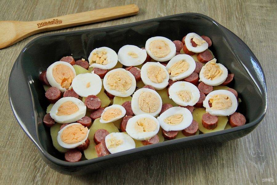 Повторяем слои в таком же порядке еще раз. Сверху посыпаем все тертым сыром и убираем в разогретую до 200 градусов духовку на 30 минут.