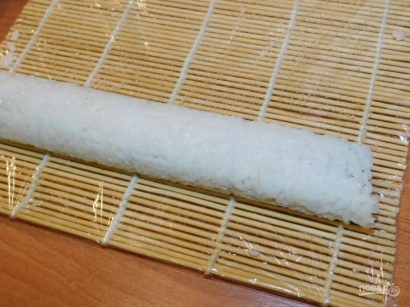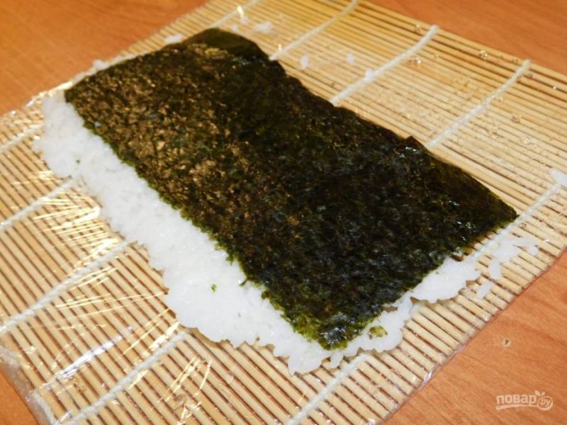 Половину листа нори уложите на циновку блестящей стороной вниз. Распределите по нори тонкий слой риса так, чтобы с одной стороны осталось около 1 см. нори, а с другой стороны рис выступал тоже примерно на 1 см. Затем переверните, чтобы рис оказался внизу.