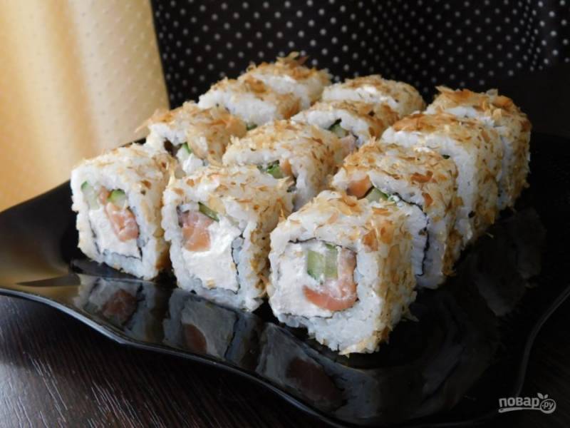 Обваляйте ролл в стружке тунца и нарежьте острым ножом. Приятного аппетита!