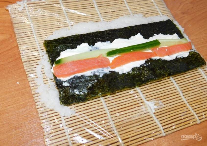 Уложите в ряд начинку: творожный сыр, огурцы и рыбу.