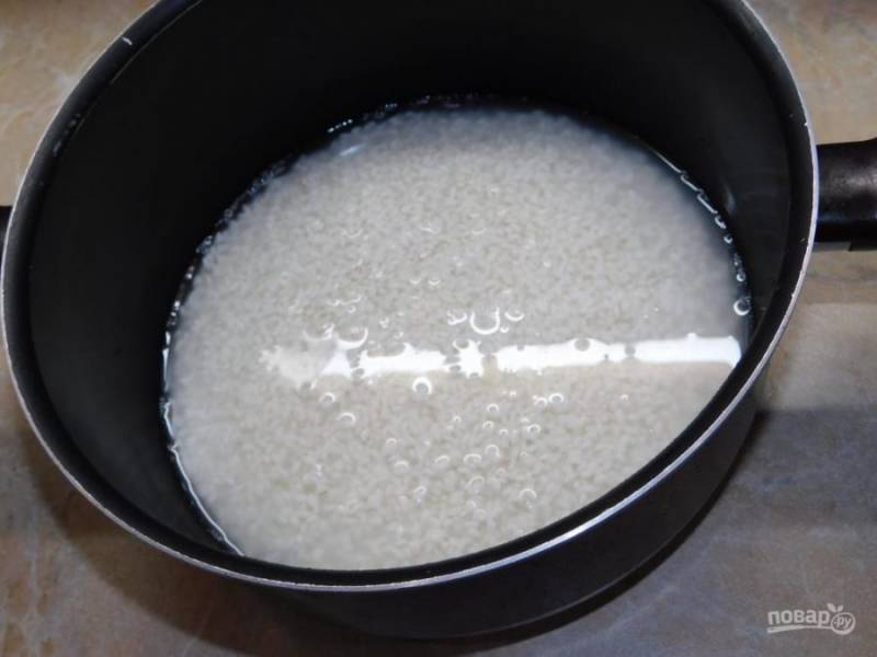 Промойте рис и залейте водой в пропорции 1/1. Доведите до кипения и выключите. Оставьте рис постоять под крышкой 20 минут.
