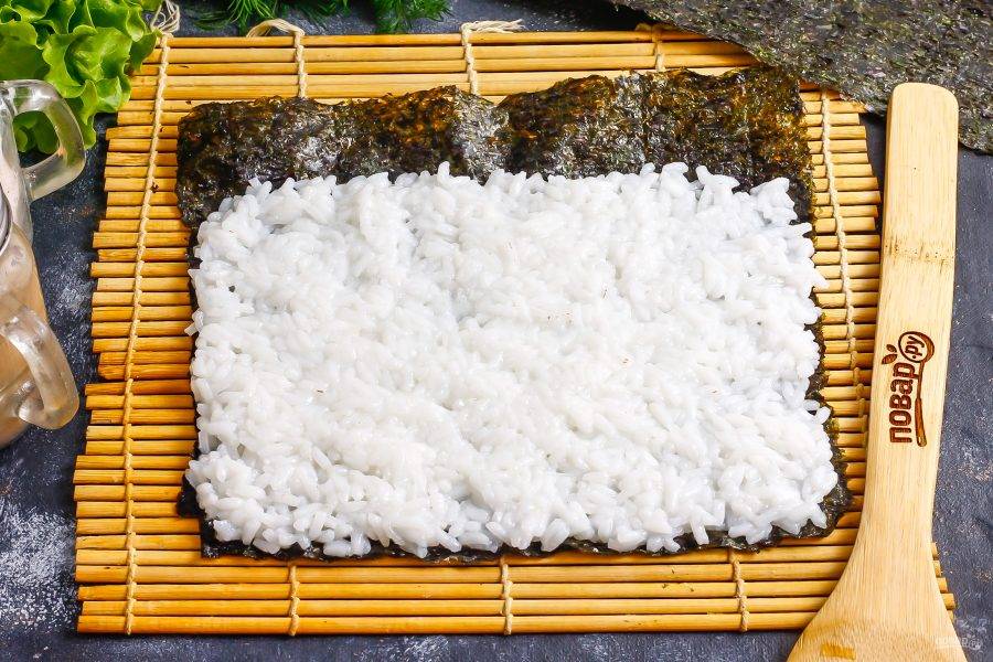 Выложите лист нори на коврик. На водоросли выложите отваренный рис, смочив руки в воде. Не заполняйте 2 см. сверху, так как нори будет закатываться в виде рулета. Тщательно разровняйте.