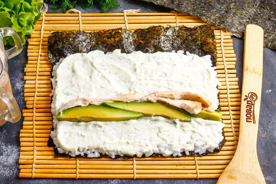 Половину авокадо очистите от кожуры, нарежьте лентами. Смажьте слой риса сливочным сыром, и на сыр выложите ломтики авокадо.