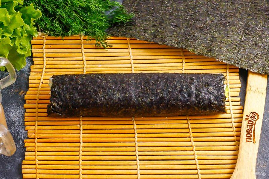 Аккуратно закрутите нори рулетом, слегка сжимая его, чтобы начинка прочно зафиксировалась в рисе.