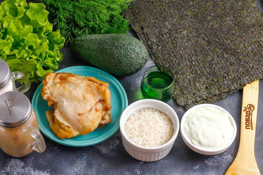 Подготовьте указанные ингредиенты. Часть куриной тушки: филе, бедрышко или окорочок заранее отварите и остудите.