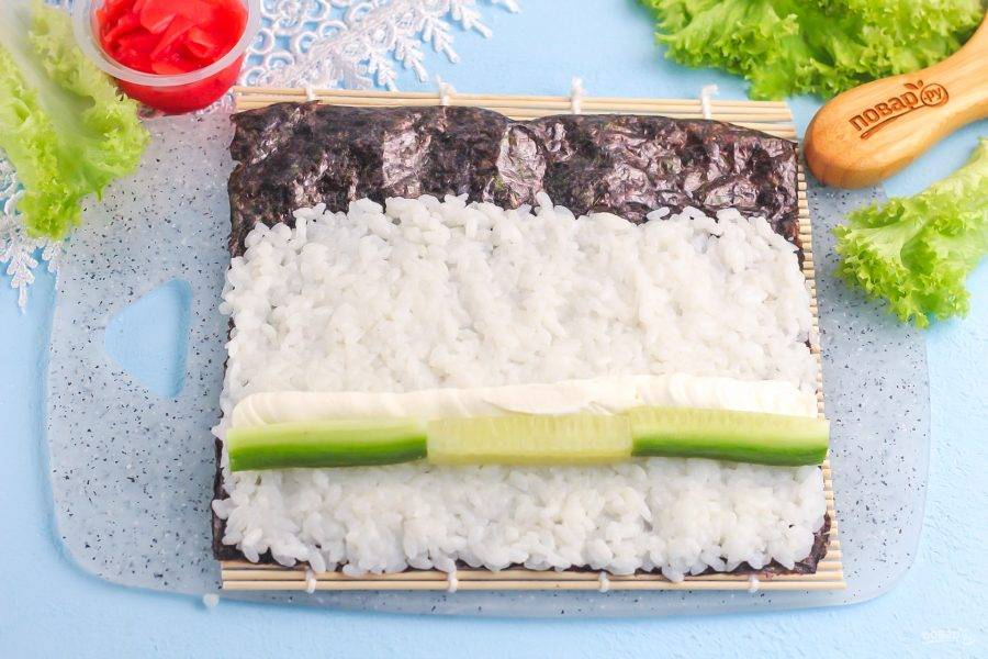 Промойте огурец и срежьте хвостики. Нарежьте овощ брусочками и выложите на рис вместе со сливочным сыром.