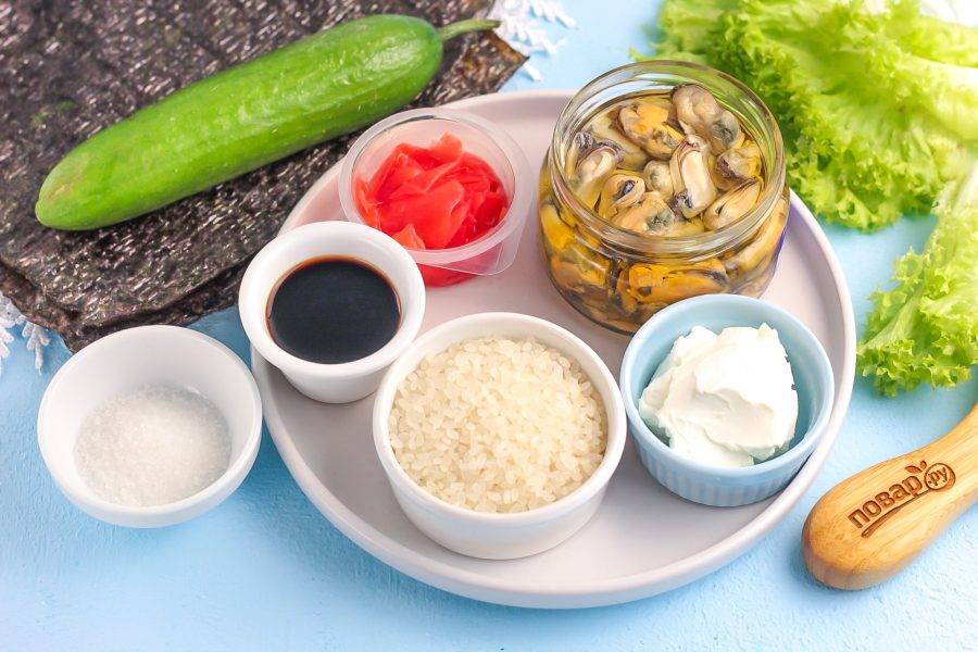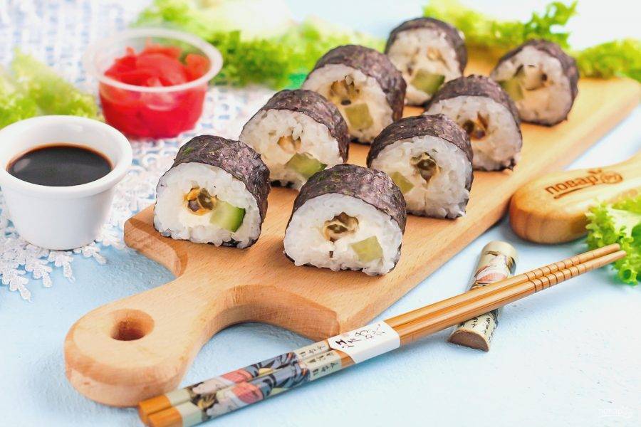 Выложите роллы с мидиями на тарелку, доску и подайте вместе с маринованным имбирем, васаби, соевым соусом. Приятного вам аппетита!