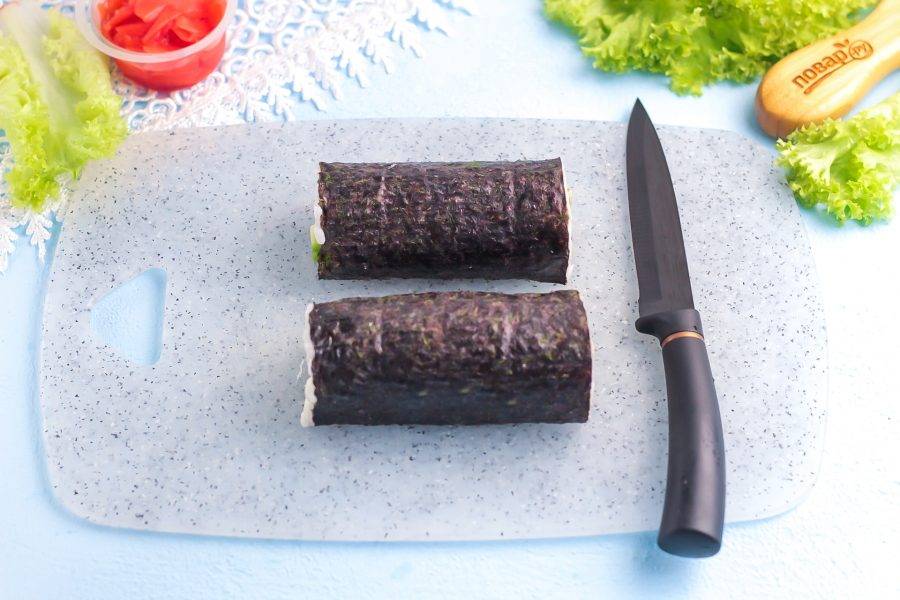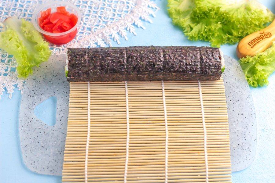 Смочите край листа нори водой и сверните все рулетиком с помощью коврика.