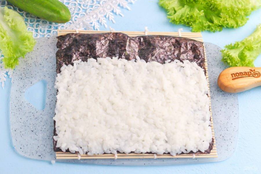 Разложите лист нори, смочите его немного водой, затем выложите на 1/3 нори рис, отступая от края 1,5 сантиметра.