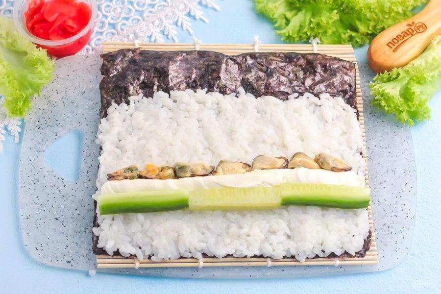 Выложите на сливочный сыр мидии, стряхивая излишнее масло.