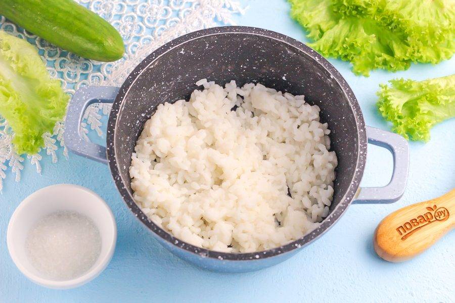Вскипятите воду в казане или ковше с антипригарным дном. Всыпьте рис и отварите 15 минут. Затем соедините рисовый уксус, сахар и соль. Перемешайте и влейте в рис, снова перемешайте, слегка остудите.