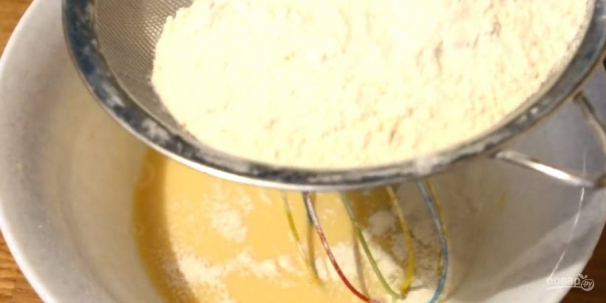 2. Добавьте два куриных яйца и два желтка. Слегка перемешайте венчиком, добавьте ванильный сахар, соль и снова перемешайте венчиком. Добавьте просеянную муку и замесите липкое тесто с помощью ложки.