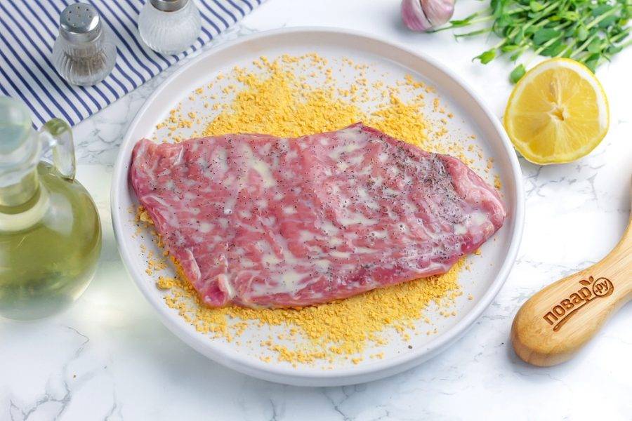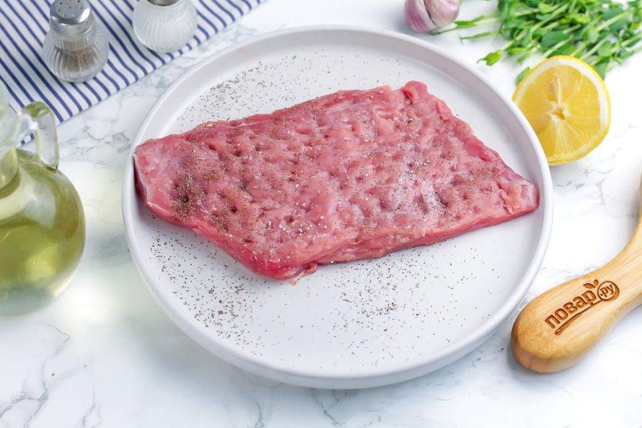 Обязательно посолите и поперчите отбитое мясо. Можно присыпать и другими специями, пряностями мелкого помола. Крупный помол исключите, так как он подгорит.