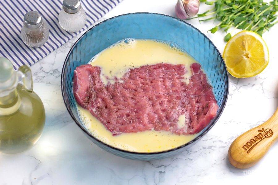 Прогрейте сковороду на плите, влейте растительное масло. Можно заменить его сливочным или смальцем — жир нужно хорошенько разогреть. Обмакните говядину в льезон со всех сторон.