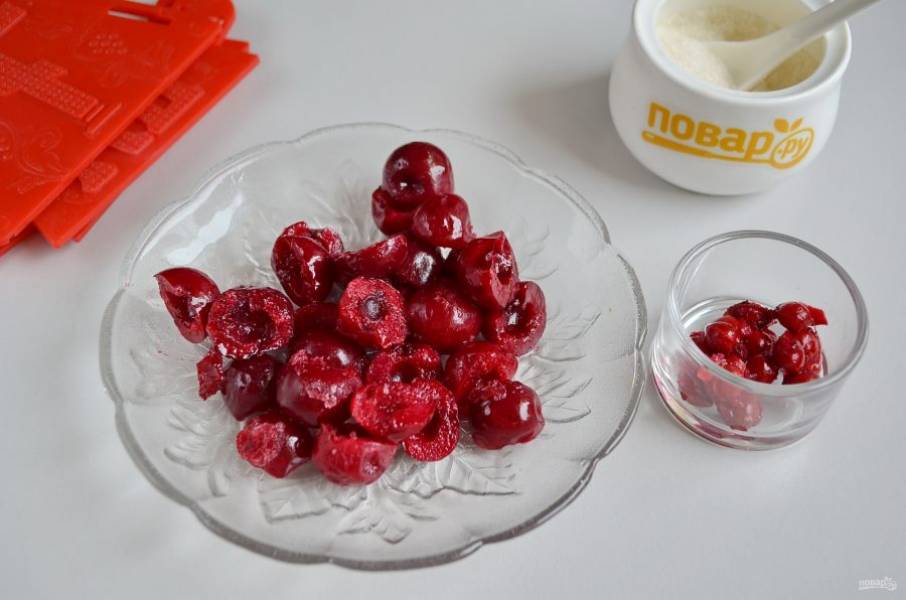 2. Замороженные вишни можно не размораживать. Удалите косточки. Насчет сока не переживайте, он выйдет под гнетом.