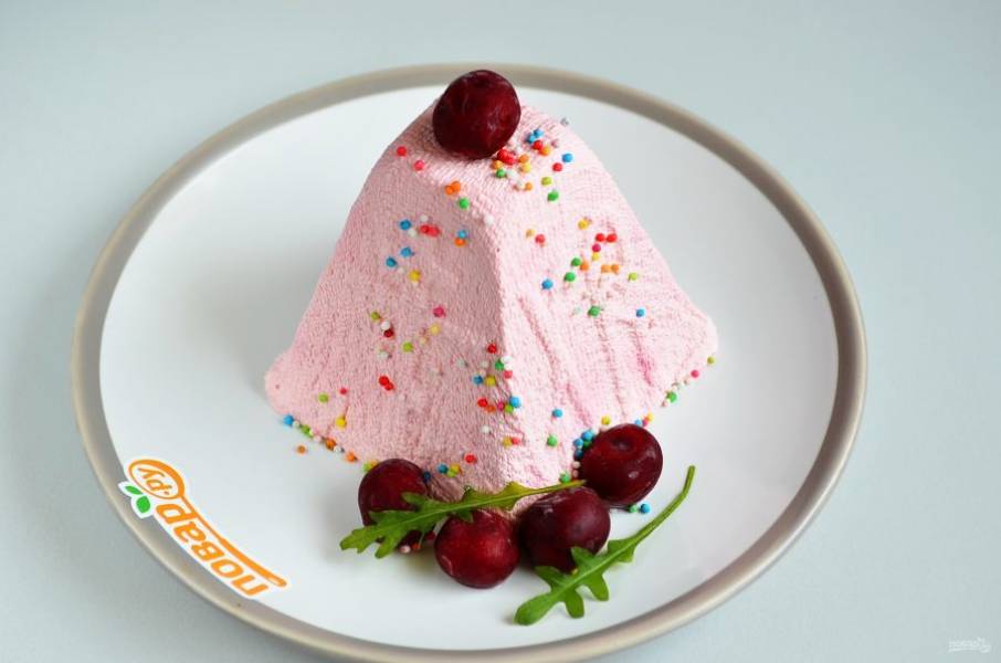 7. Достаньте готовую пасху их холодильника, накройте тарелкой, быстро переверните. Форма легко снимается. Уберите осторожно марлю и украсьте вишенками и кондитерской посыпкой.