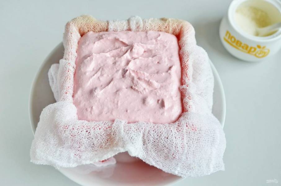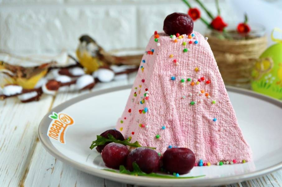 Предлагаю сделать праздник более ярким, в этом мне поможет отличный рецепт розовой пасхи. Ее можно сделать с вишнями, малиной или любым красным вареньем.
