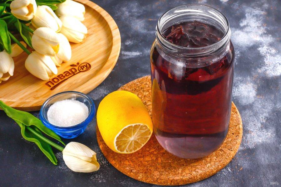 На дно кувшина или любой другой глубокой емкости для горячего выложите бутоны каркаде. Вскипятите воду в чайнике и залейте их кипятком, оставляя на 5 минут. Затем бутоны удалите.