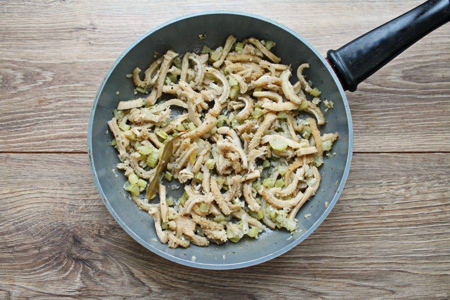 Остывший рубец порежьте крупной соломкой и выложите в сковороду с овощами. Все посолите, поперчите и добавьте лавровый лист, мяту, тимьян и влейте вино.
