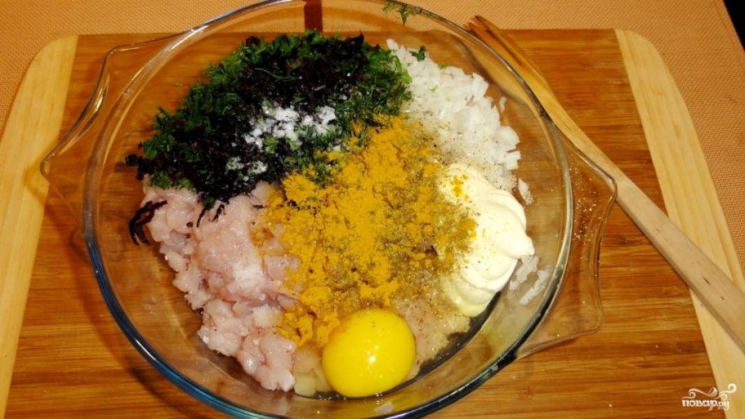 К мясу добавляем яйцо, майонез, лук, зелень и специи.