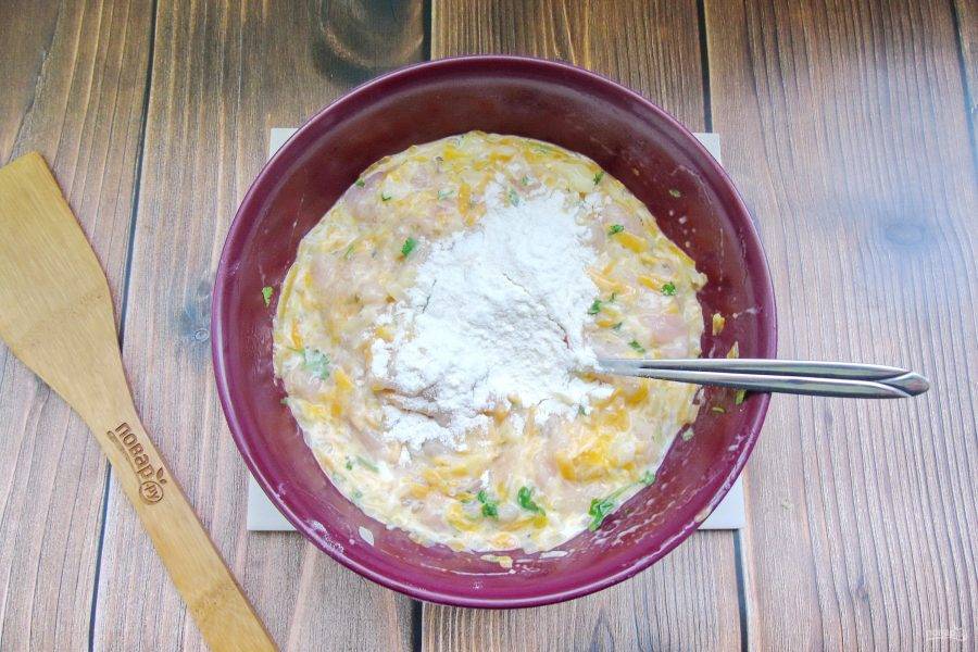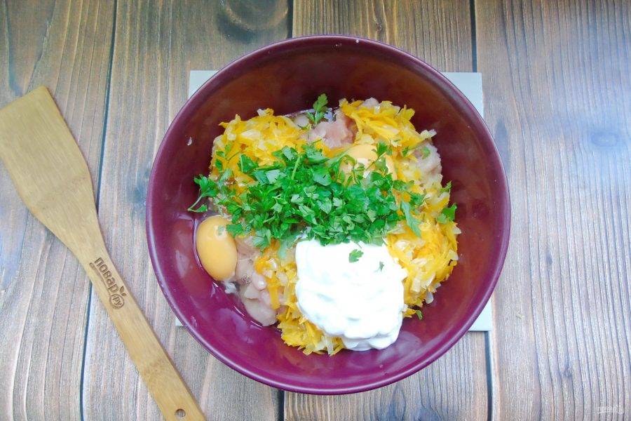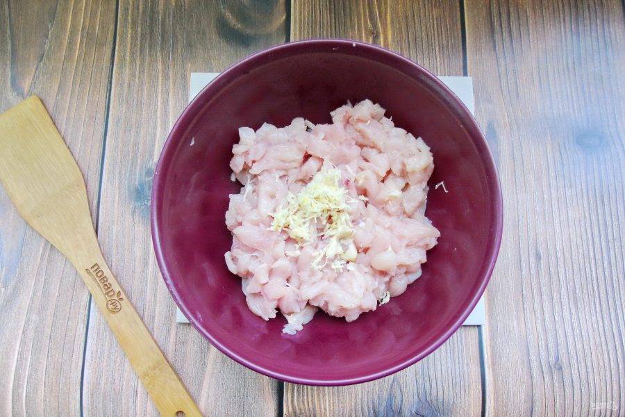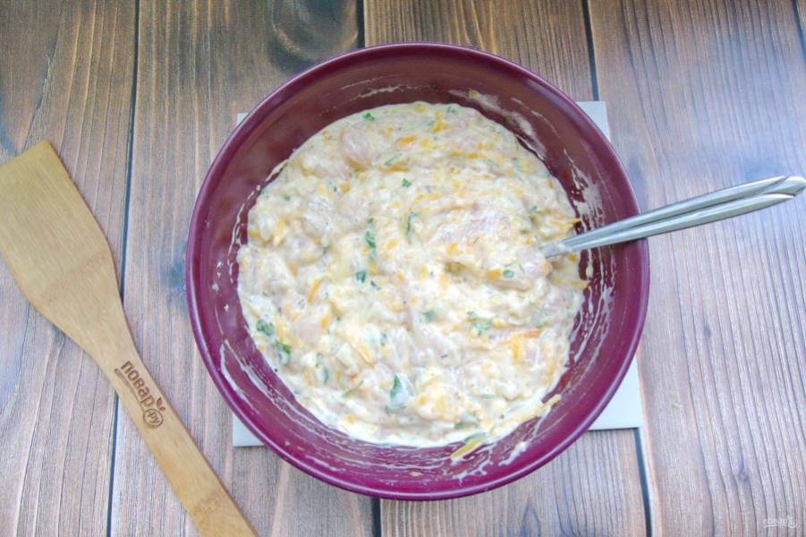 Филе индейки помойте, немного отбейте и мелко нарежьте. Выложите в миску.