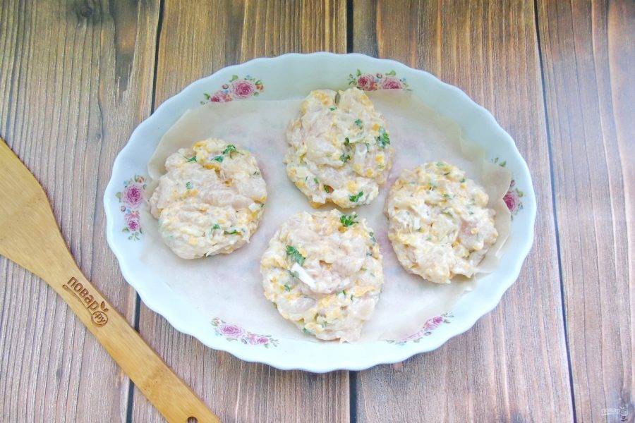 В форму для выпекания постелите пергамент. Поставьте кольцо диаметром 7-8 см. В кольцо выложите фарш.