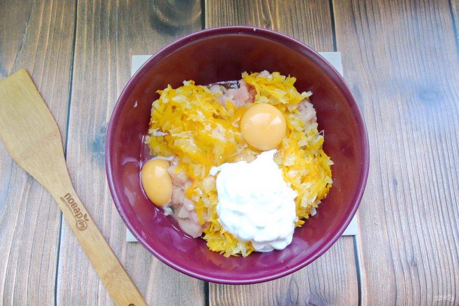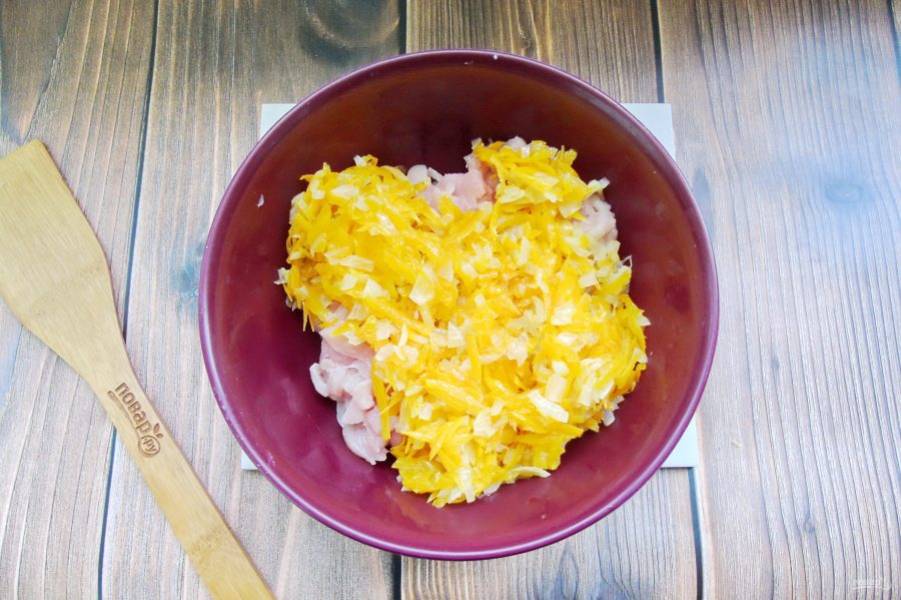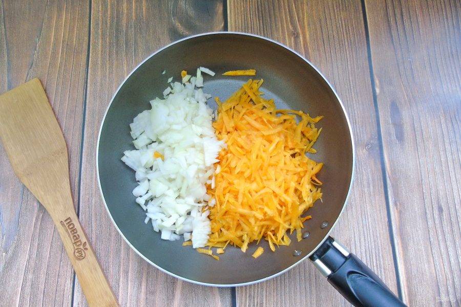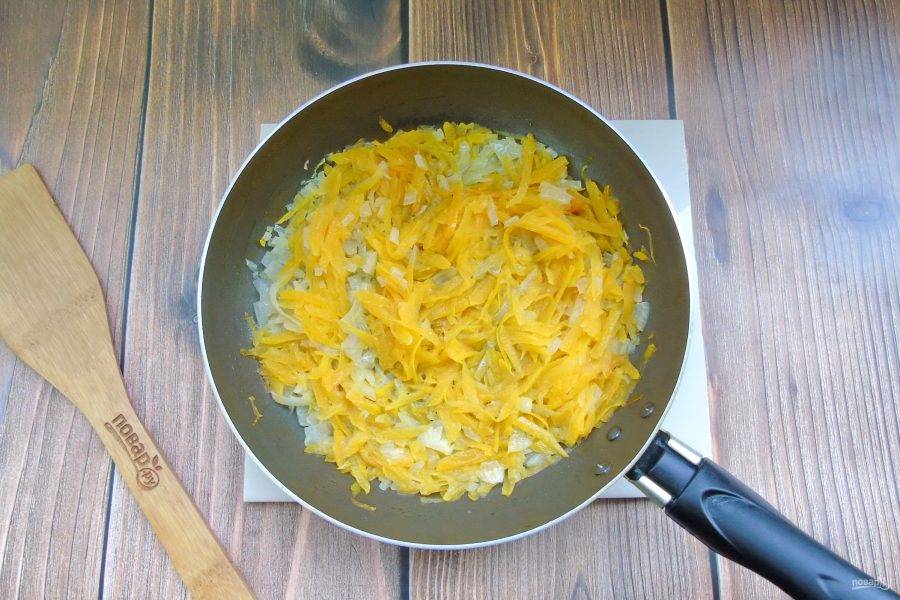 Репчатый лук и тыкву очистите, помойте. Лук мелко нарежьте, а тыкву натрите на терке. Выложите в сковороду с подсолнечным маслом.