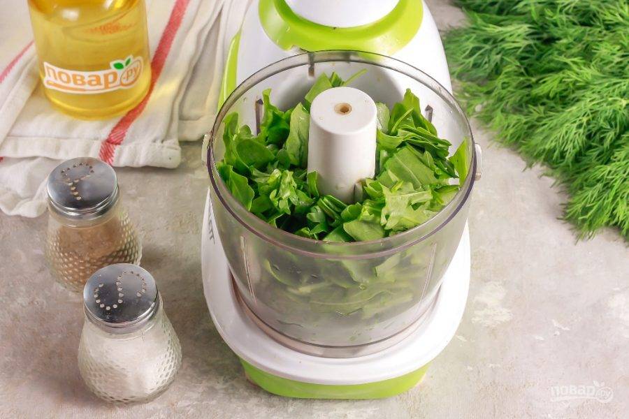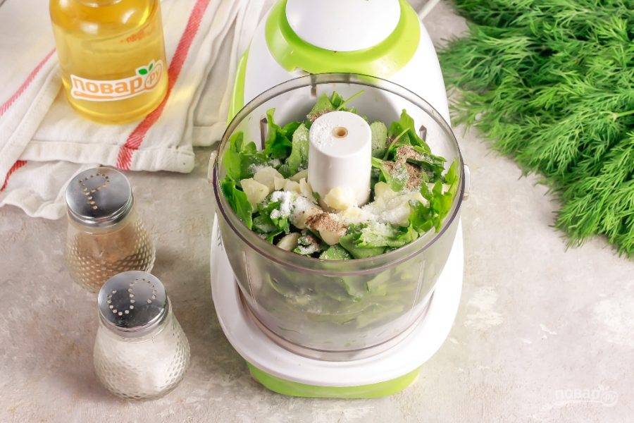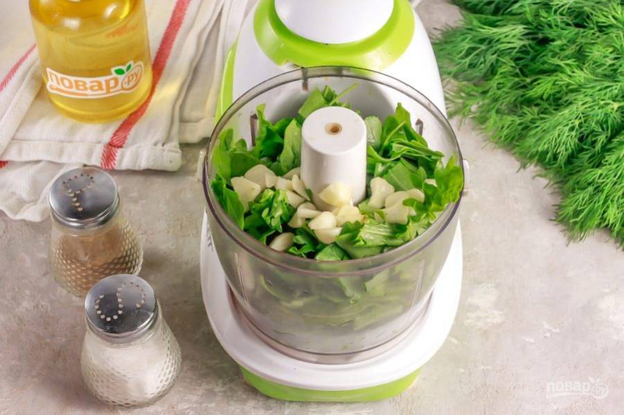 Рукколу промойте в воде, стряхните лишнюю влагу, срежьте стебли и выложите в чашу измельчителя или блендера.
