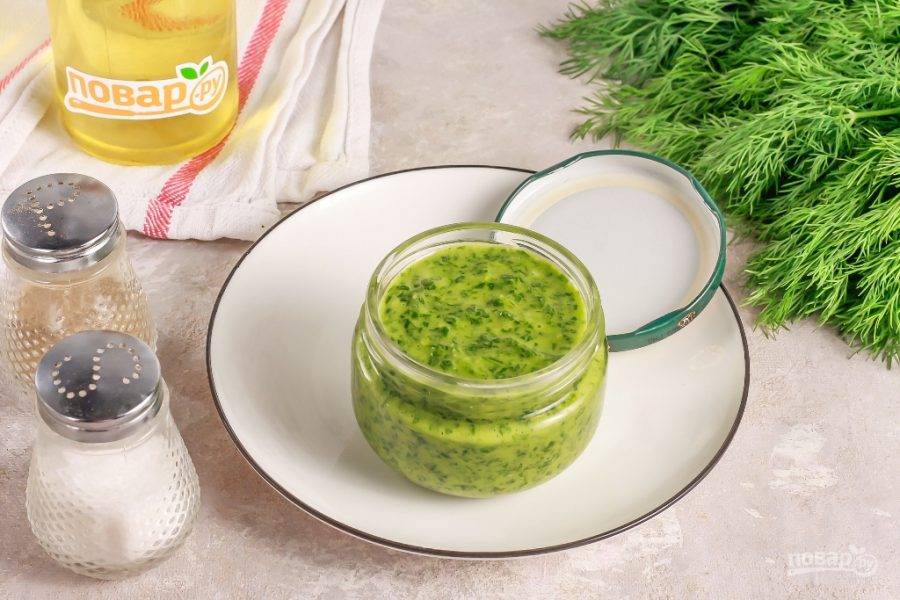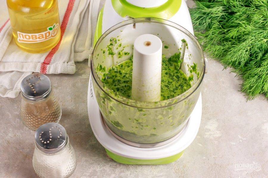 Влейте растительное масло без аромата и измельчите все содержимое емкости в течение 3-4 минут. Благодаря маслу соус получится эмульгированным, плотным и бархатистым на вкус.