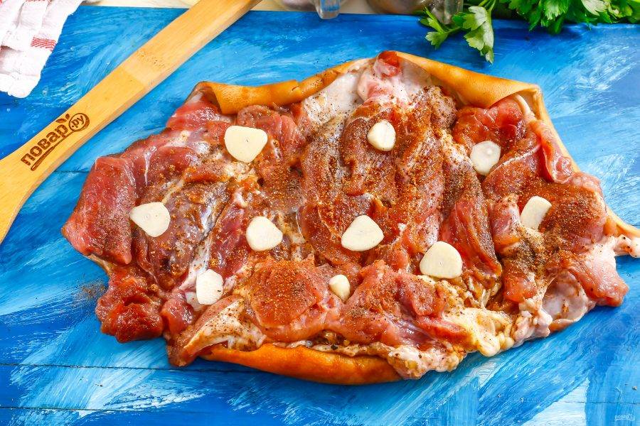 Сочный и праздничный рулет из брюшины готовится просто. Вам не нужно отбивать мясо или шпиговать его чесноком, перцем. Достаточно разрезать в нескольких местах и обмазать специями, приправой.