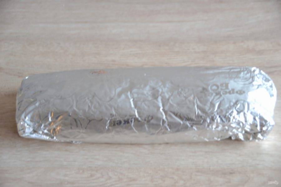 Сверните рулет, плотно оберните фольгой. Запекайте в духовке 1 час при температуре 180 градусов.