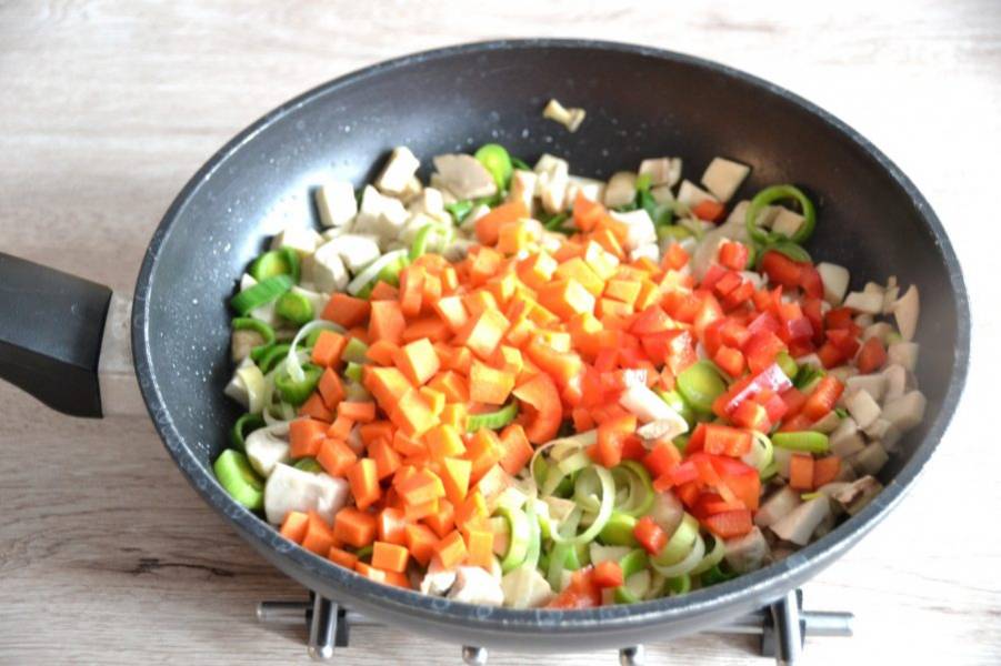 Добавьте порезанные мелким кубиком морковь и болгарский перец, слегка потушите.