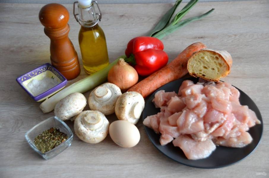 Слегка обжарьте в сковороде на растительном масле с добавлением сливочного масла сначала шампиньоны, затем добавьте лук-порей.